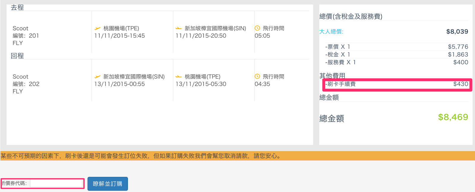 請注意,有些航空公司是以外幣計價,所以會收取境外刷卡手續費。若您有AutoTrip提供的折扣券,也可在此步驟輸入,抵扣總金額哦。