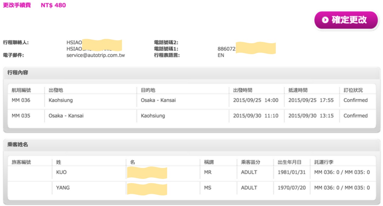 登入後即可進入訂單與行程內容頁面,此頁面包含行程聯絡人資訊、搭乘者資訊、護照資料、機位與機票資訊與費用/付款明細等等。使用者可經由頁面上的功能進行加購行李、修改護照號碼與變更行程內容。