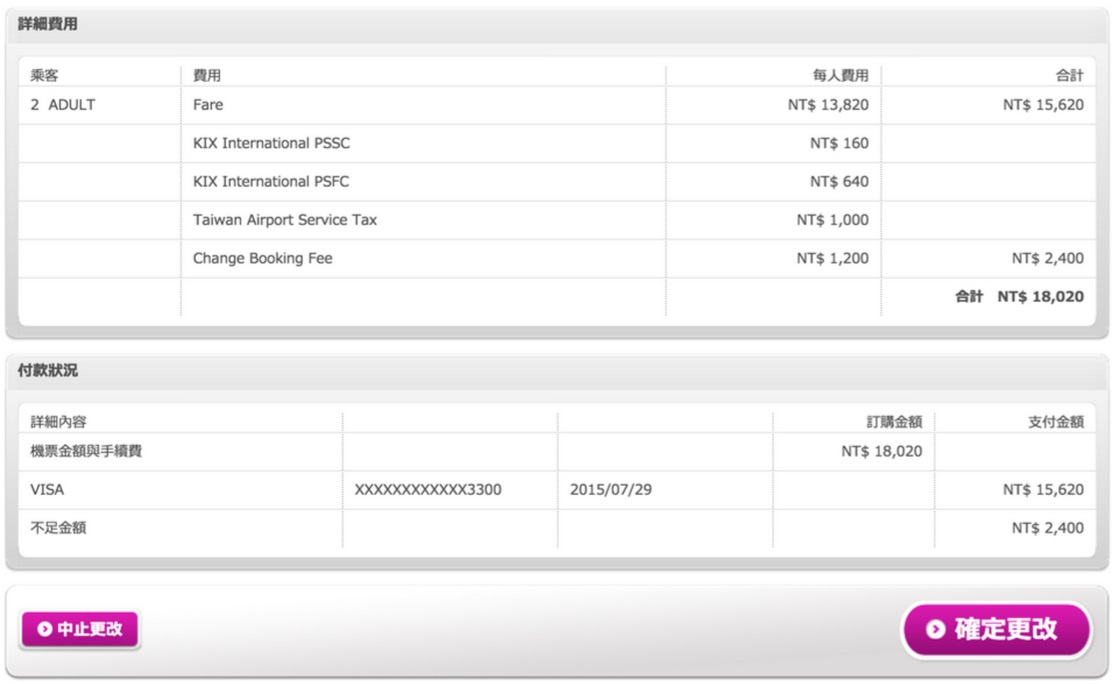 同意更改後,會進到付款頁面~以信用卡付款即可完成所有變更動作。