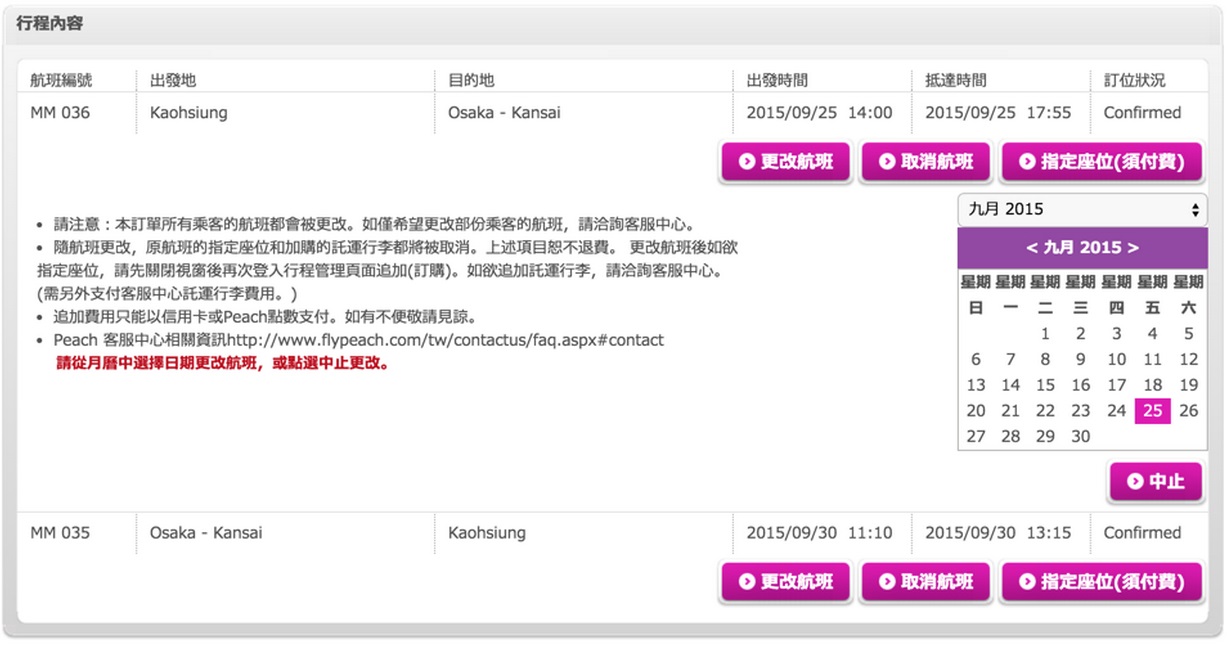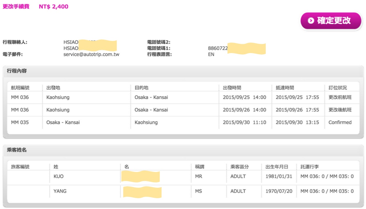 ◎提醒您,透過網路平台更換行程訂單內所有搭乘者會一起變動,如僅更換單一搭乘者請洽樂桃客服專線。