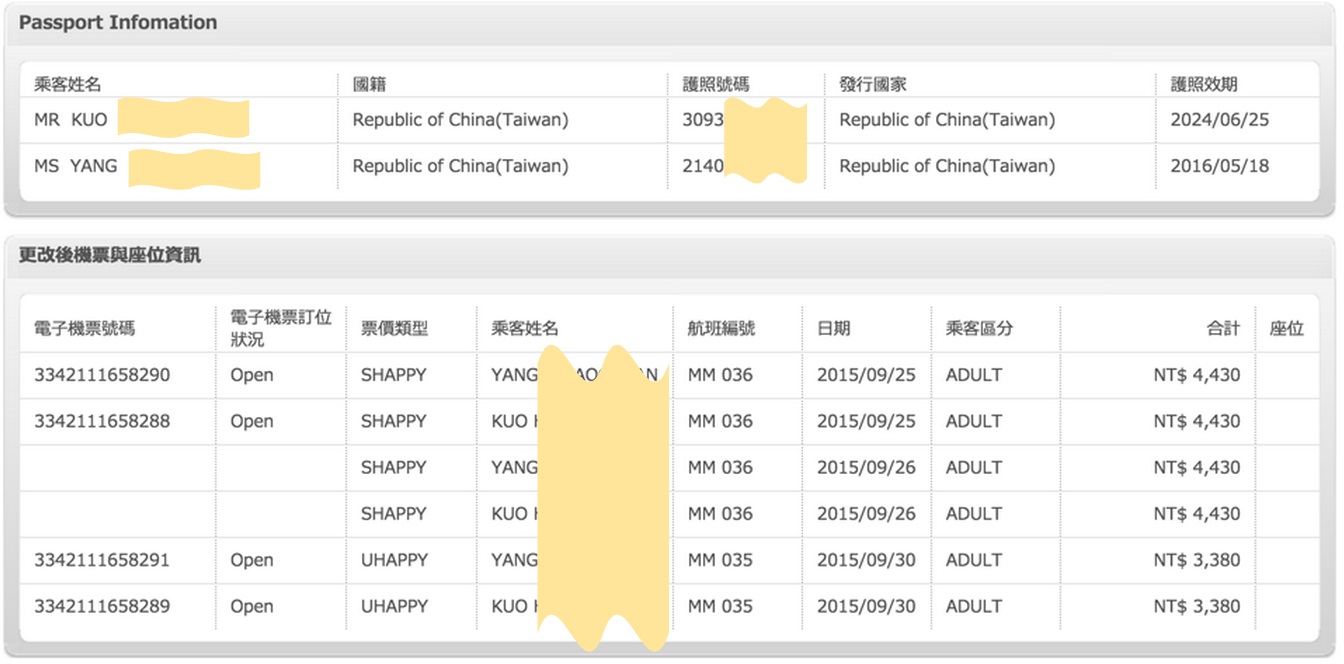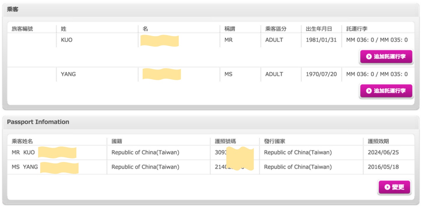 登入後即可進入訂單與行程內容頁面,此頁面包含行程聯絡人資訊、搭乘者資訊、護照資料、機位與機票資訊與費用/付款明細等等。使用者可經由頁面上的功能進行加購行李、修改護照號碼與變更行程內容。