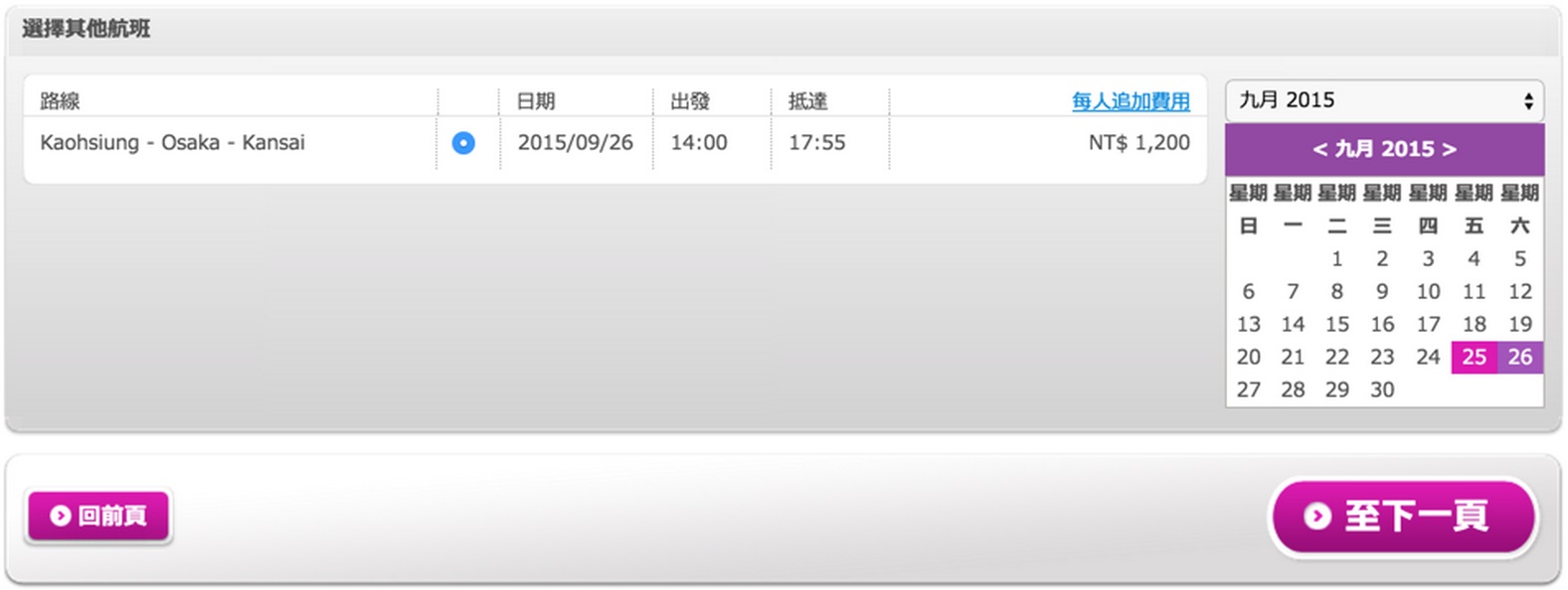 選擇更換日期後再點選「更改行程」按鈕後,即出現下圖。顯示更換後的日期、航班時間與須追加的費用。