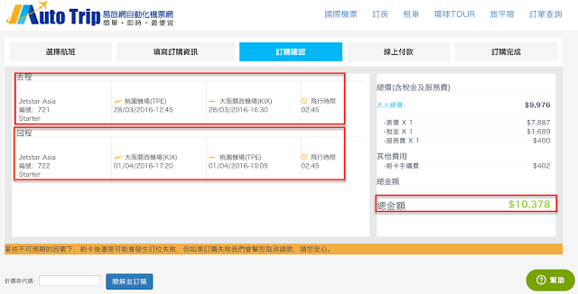 步驟五:線上付款 AutoTrip廉價航空有30分鐘的付款限制,請於訂購後30分鐘內付款。
