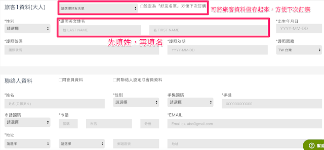 (請注意,英文姓名不要填反囉,一旦開票後,有些航空公司的姓名是不允許修改的,您只能重新訂購,有些則是需要改票手續費,所以一定要看清楚再填寫哦!)